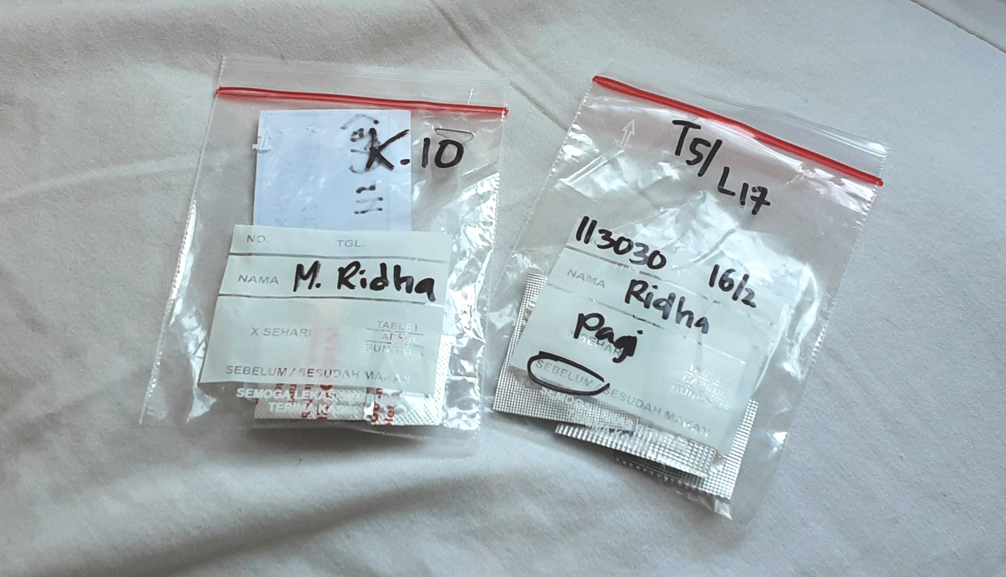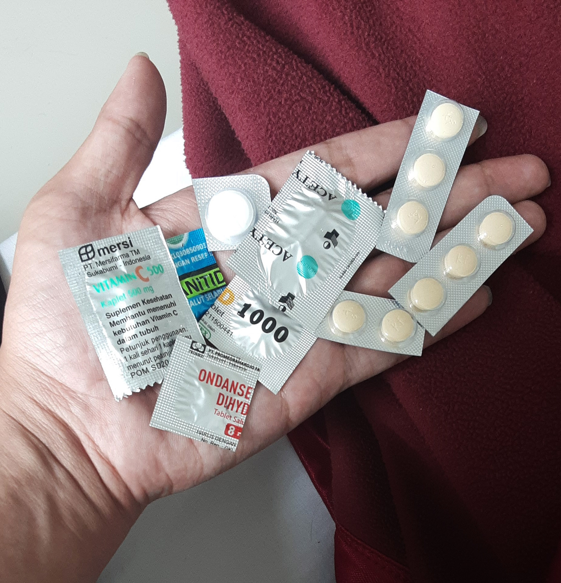 Sebagai yang sering kesulitan mengonsumsi obat tablet, saya cukup dibikin kaget ketika disodori sebungkus obat berisikan belasan tablet. Isinya beraneka ragam, mulai vitamin, anti virus, paracetamol, obat mual, dan obat lainnya yang tidak saya ketahui fungsinya.