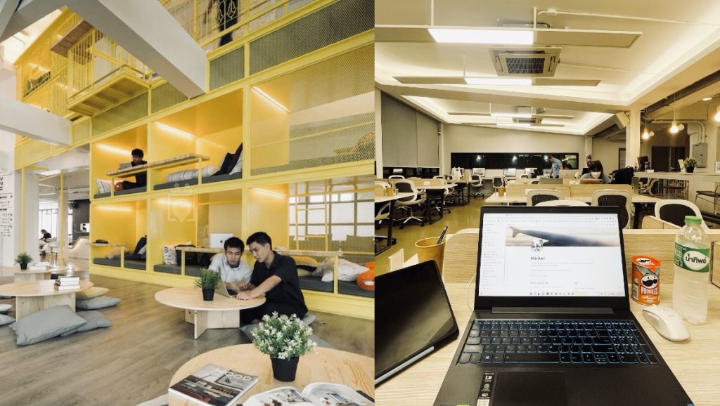 Tempat ini kiranya adalah favorit saya. Walaupun berbayar, fasilitas yang ditawarkan sesuai dengan yang kita bayarkan. Untuk akses empat jam, tarifnya adalah 150 THB, atau jika dirupiahkan sekitar 60k. Di sini, ada banyak space yang bisa kita gunakan, baik yang dengan komputer maupun tidak. Selain itu, co-working dua lantai ini juga menyedia pod beserta bantal yang bisa kita gunakan untuk tidur. Di setiap mejanya juga terdapat banyak colokan jadi tidak perlu khawatir akan kehabisan daya saat menggunakan laptop atau gadget lainnnya.