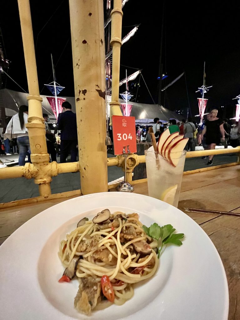 Saya pikir tempat ini favorit di kalangan traveler. Jadi mayoritas dari kalian juga saya rasa sudah tahu mengenai cantiknya tempat ini. Wisata ini menjadi primadona karena banyak penjual makanan, souvenir, arsitektur yang menawan, hingga karena lokasinya yang menghadap langsung Sungai Chao Phraya yang membelah Kota Bangkok, Thailand. Tapi perlu diingat, karena kepopulerannya, tempat ini akan sangat ramai di jam-jam tertentu. Nah, saat itu saya memutuskan untuk makan malam di salah satu restorannya. Saya memang mencari spot terbaik untuk makan sambil merenung ditemani desiran angin malam dan alunan lagu. Untuk harga menurut saya masih terbilang terjangkau. Satu porsi sphagetti dibanderol 200 THB dan satu coketail seharga 150THB yang jika dikonversi ke rupiah totalnya adalah 130K Rupiah.