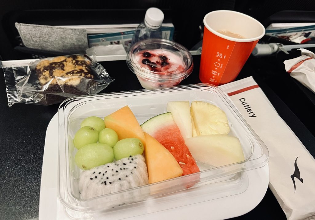 Pengelihatan saya perlahan mulai jelas. Walau rasanya mata seperti habis dilem, dan lampu di pesawat yang cukup silau membuat saya mengucek mata saya berkali-kali. Pandangan saya tertuju pada penumpang samping dan depan sambil sedikit mendongakkan kepala. Rupanya, semua penumpang telah dihidangkan makan malam.